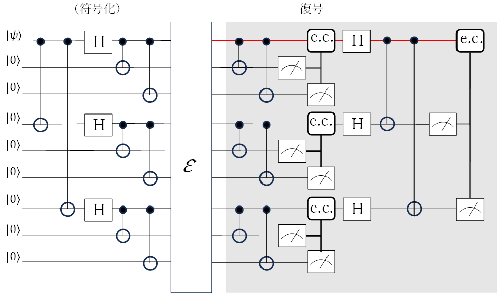 すると、状態変化が生じた後に測定を行う(測定の行い方は補遺参照)ことにより、ある確率でいずれかの項が選択され、そのEkに対して、状態は\(\left|\psi\right\rangle\)(エラーなし)、 \(X\left|\psi\right\rangle\)(ビット反転)、\(Z\left|\psi\right\rangle\)(位相反転)、\(Y\left|\psi\right\rangle=iXZ\left|\psi\right\rangle\)(ビット、位相反転)のいずれかに収縮する。測定結果に従ってエラー訂正をすることで、\(\left|\psi\right\rangle\)に戻ることになる。**
