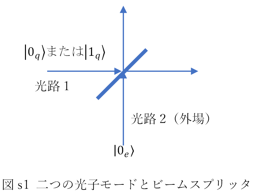 この例では、図s1のように、2本の光路の一方に注目して(光路1=対象の光路)、他方の光路(外場)には初期状態で光子がない(\(\left|0_e\right\rangle\))場合に、ビームスプリッタ通過後の、対象の光路の状態を計算している。